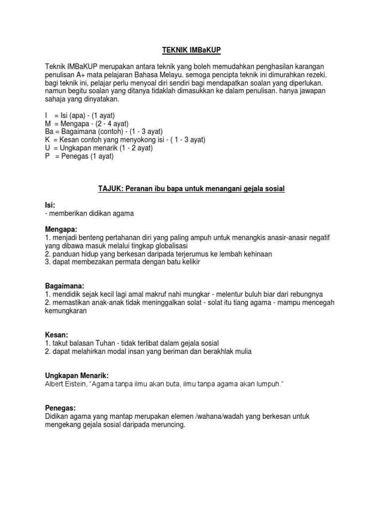 Ungkapan Menarik P. Umum mengetahui bahawa. Hari ini mari kita lihat teknik IMBaKUP yang sekian lama telah digunakan oleh guru dan murid-murid di seluruh Malaysia dalam mengembangkan sesebuah perenggan isi karangan dengan baik.